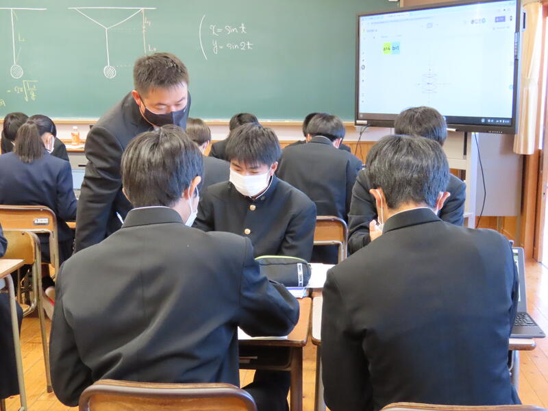 その仕組みを生徒同士で話し合った後、グラフ作成ソフト「DESMOS」を用いて、生徒がリサージュ曲線を表す媒介変数表示の係数を変化させながら、気づきを共有しました。