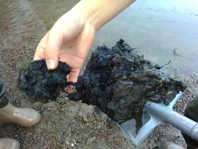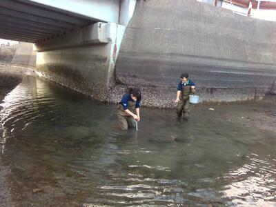 Today, the “Brackish-water” group went out to the river wearing waders. They were walking towards the ocean in search of sludge outside the brackish water area, as well as measuring the salinity of the river water. After 15 minutes of walking, they arrived at the Gion Bridge, which is a lovely and elegant stone bridge built in 1832. Searching around the bridge, the river bottom was full of stones and sand, and there was none of the sludge they had been longing for… feeling lost, they googled: "where is sludge?" Do you know what they got? - Well, the top result was how to get one of the Pokemon items, "Black Sludge"... looks like they have no other choice but to look for the “real” sludge by themselves.