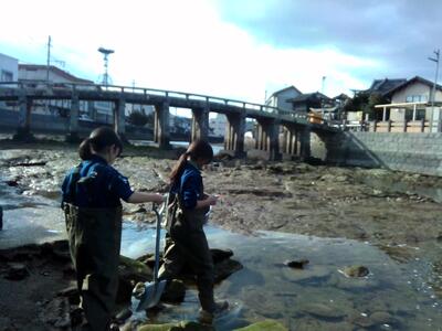さて、今日は冬晴れの中、久々に汽水域班がウェーダー着用で川に出かけました。今日は汽水域以外のヘドロを求めて、海の方まで歩いてみるとのこと。塩分濃度計で川の水の塩分を計測しつつ、学校前の町山口川を、どんどん海に向かって歩いていきます。ちなみに、塩分0.05-3.0%が汽水域なんだそうです。