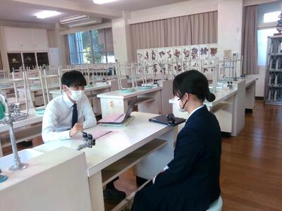 本日のASⅢでは、E1(提案を創造する)、E2(地域を創造する)の2つの本評価を実施しました。生徒たちはパソコン室でまず自己評価(評価シートに記入)をし、それぞれの担当者が待つ部屋に向かいます。先行研究を活かすことができたか、地域にどのような提案ができたか、地域と連携して研究を進めることができたかなど、合わせて11の評価項目について、しっかり自分の言葉で説明することができていました。