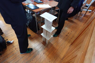 その後、先日のSSTの時間にも行った「ペーパータワー」の活動を行いました。この活動のゴールは紙だけを使って自立する高いタワーを作ることですが、実は、結果というより、その過程にこそ、この活動の意味があります。というのも、ASⅠでは、グループに分かれてそれぞれ設定したテーマに沿って研究を行っていきます。その中で、班でしっかり意見を出し合うことで、研究が進んでいくのです。また、班員だけでなく担当の先生や他のグループ、学校外の方々とも関わり合い、連携していくことで研究は更に広がり、深みを増していくことでしょう。今回の活動でしっかり班内で意見を出し合えたか?役割分担ができたか?前回の活動の経験を活かすことができたか? 短時間での活動でしたが、楽しむだけではなく、それぞれ様々な学びが得られたことでしょう。