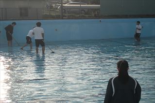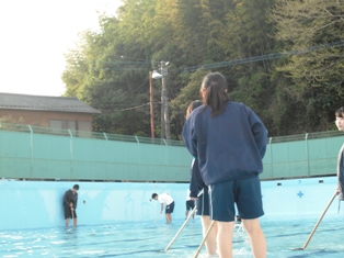 部活動も新入生を迎えて本格始動です。プールでは、水泳部も裸足で掃除をしていましたよ!