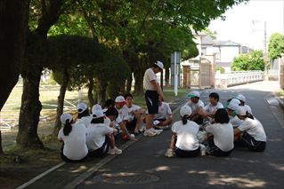 気温26度、飛行機雲も見える青空の下、体育大会予行を行ないました。