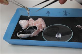 新鮮な豚の眼球と、缶詰めの鶏頭を用い、肉を取り、組織を観察する学習です。