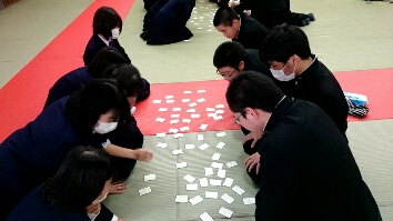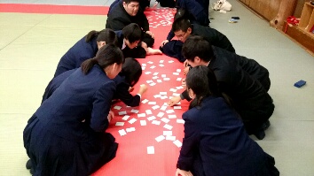 3対3の競技かるた形式で、クラス優勝を目指して取り組みました。