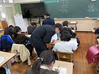 3年生から6年生の割り当てられたクラスで、小学校の先生の添削指導のお手伝いを行いました。 小学校から出されたプリントやドリルの問題を解き終えた小学生のもとへ行って、丸つけや質問に応じます。 参加者は前回参加の生徒と変わり、本日参加した生徒も最初、緊張していましたが、小学生の元気良さのおかげで、すぐに馴染むことができ、声かけもスムーズにできたようです。