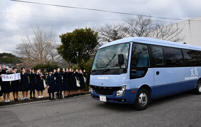 受験に臨む3年生がバスで本校を出発しました。