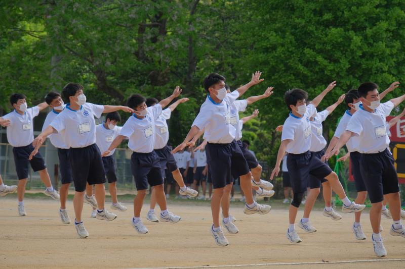開会式の後、まず始まったのは、天高体操。約600人の生徒が一糸乱れず伝統の体操をする姿は、圧巻です。それから観客を魅了する2年生、3年生のダンス。天高の体育大会のダンスは、ダンスリーダーを中心としたキレのあるダンスはもちろん、女子だけでなく男子も「かわいい」を全力で表現するところ、踊っていない生徒もかけ声で盛り上げる、一体感が魅力でもあります。盛り上がったダンスが終了すると、人文字に移ります。グラウンドいっぱいに「天」「高」、そして、校章の桜が綺麗に咲き誇りました。芸術部書道部門による、「正大」「剛健」「寛厚」の三綱領がグラウンドに華を添え、今年のマスゲームも大成功となりました。