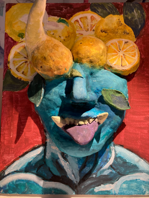 油絵みたいですが、なんと立体造形なんです。作品名は「MEGANAI」(キャンバス 石膏粘土)。鬼北町の名産品である柚子に鬼も「目がない」みたいですね。