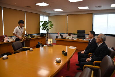 6月11日(水)、3月28日(金)に東京で行われた第29回全日本中学生・高校生管打楽器ソロコンテスト高校生部門で第1位、文部科学大臣賞を受賞した3年の佐佐木連斗さん(アルトサクソフォーン)が、天草市長を表敬訪問しました。