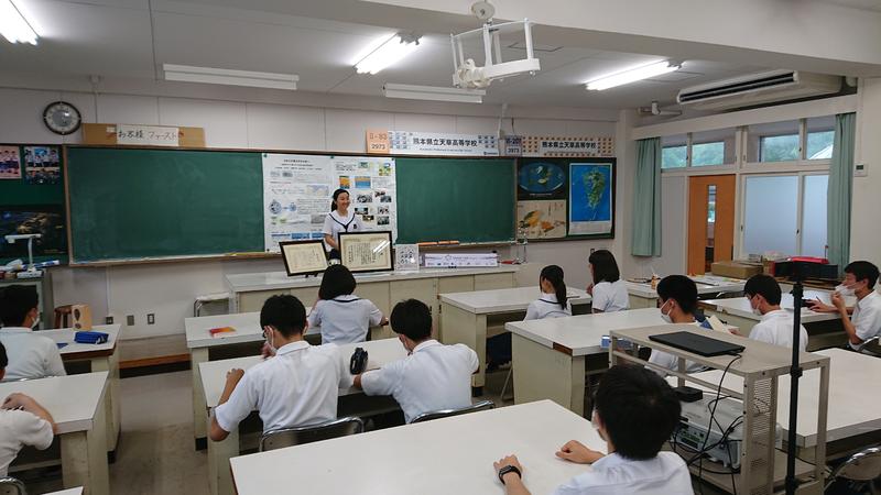 私たち科学部は、先輩方の研究結果や先生方のご助言を参考にして、毎年10月に行われる生徒理科研究発表会に向けて研究を行っています。昨年はシンガポールで行われた国際大会に2度目の出場を果たし、世界大会入賞を目指して研究しています。数年前からは天草市と共催でアマプロ(SDGsシンポジウム)を実施し、研究成果を社会に生かすための取組も行っています。