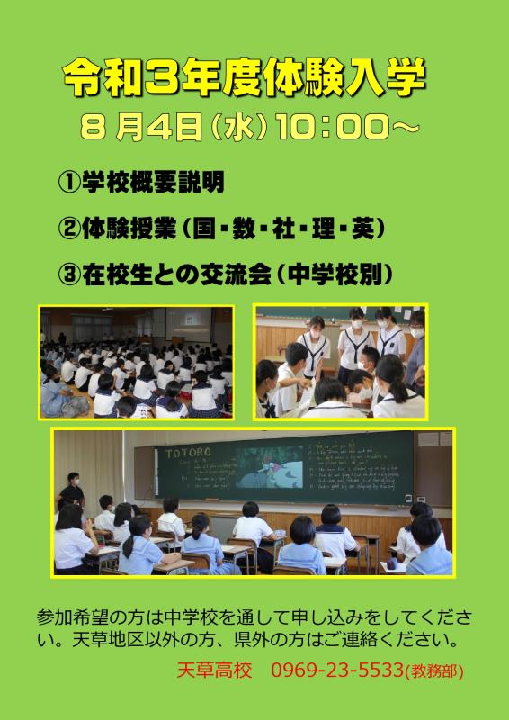 令和3年度の体験入学を下記の通り実施します。