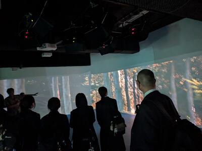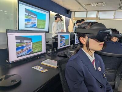 その後、情報学科に移動して、AIやVR、データをどのように活用して研究が進められているかについて、用いられている技術や仕組みとともに教えていただきました。靜宜大学の敷地内にある教会にプロジェクションマッピングを行ったり、VRを着用して自動車を運転するシミュレーションをしたりといった学生の活動や、どのように研究プロジェクトを進めているかについて詳しく知ることができました。その後、VRを実際に体験したり、映像に特化した部屋でAIを活用した映像技術を体験させていただくこともできました。