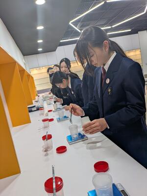 お昼からは、化粧品学科での講義と実習です。今回は、台湾の言葉で「芳香晶球」と呼ばれる、消臭ビーズ(香り玉)の作製体験を行います。体験の前に、この学部で行われている研究や国際的な活躍について説明を受けました。紹介動画ではAIが日本語でのアナウンスを担っており、その技術力の高さにも驚かされました。その後、どのような化学反応を経てこのビーズが作られるのかについて学習しました。その後は、実際の作業に移ります。アルギン酸ナトリウム、乳化剤などを正確な分量で測りとり、撹拌した後、スポイトで滴下させて球体の形を形成していきます。香料として用いたのは、レモンのような香りのする「山胡椒」の精油。よく化粧品にも用いられる材料とのことです。集中力が必要な工程も多かったものの、お互いに教え合い、よい香りに癒やされながら学ぶことができました。