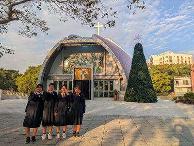 研修を終えた私たちは、移動までの待ち時間を活用して靜宜大学の敷地内にある教会、「主顧聖母堂」を訪れました。小さくて可愛らしいフォルムの教会、中に入らせてもらうと、アットホームながらも厳かな雰囲気です。靜宜大学では、カトリック系の大学らしく、建物にキリスト教由来の名前がつけられていたり、廊下やロビーなどあちこちにクリスマスのデコレーションや関連の展示がなされています。この教会もライトアップされると、昼間とは違った華やかな雰囲気となり、それもまた素敵てす。観光名所にもなっているというこの教会、機会があれば、ぜひ足を運んでみてください。