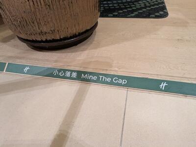 ロビーを探索すると、面白いものがたくさん。お菓子や甘栗が売ってある自動販売機に一緒にカービィのマスコットが売ってあったり、段差を知らせるサインが"Mine the Gap"だったり(mindではないのです)。
