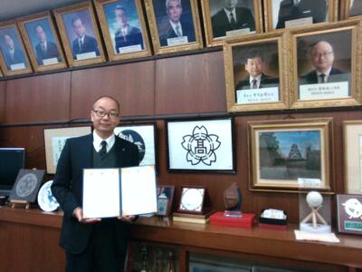 写真で岩嵜校長が手にしているのが覚書、隣の四角い盾が靜宜大学からいただいたもの、その隣の赤い台座に載ったクリスタルの盾が中興高級中学からいただいたものです。友好の印を大切に、今後ますますその絆を深めていきたいと思います。