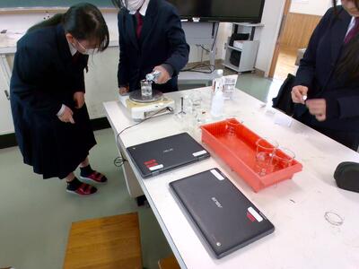 今日はお天気にも恵まれ、研究活動のために学校の外に出る班もありました。その1つがホタル班ならぬ「カワニナ」班(グループ名が変わったそうです!)。今日は、学校の近くを流れる町山口川で、ホタルのえさであるカワニナや苔の様子を観察してくるとのこと。実際に河原に降りて水に触れてみると... やっぱり、「冷たっ!」という声が思わず出てしまいます。南国・天草でもさすがに1月は水が冷たいんですね(そういえば、今朝は車の窓もガチガチに凍っていました)。寒さのためか、カワニナには残念ながら出会えなかったものの、苔はしっかり確認できたそうです。これが研究の進展につながっていくといいですね。