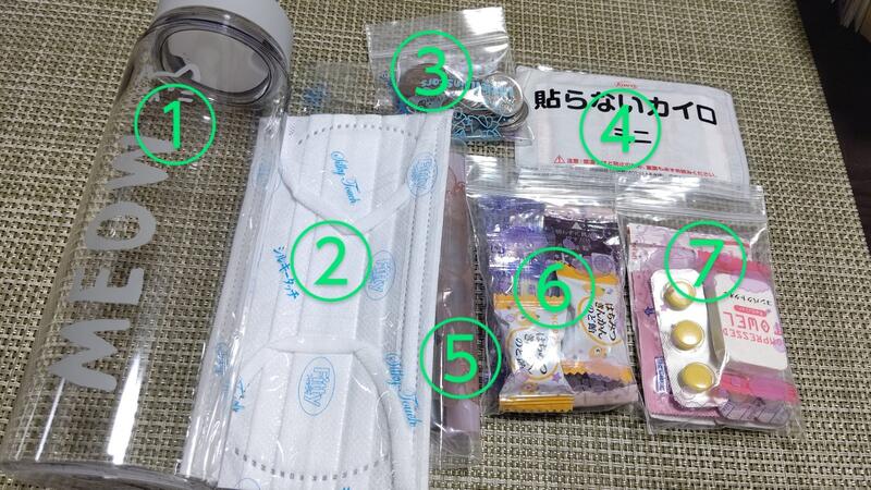 ⑦救急用品と薬(絆創膏、アルコール消毒綿、圧縮タオル、イブ、ストッパ)