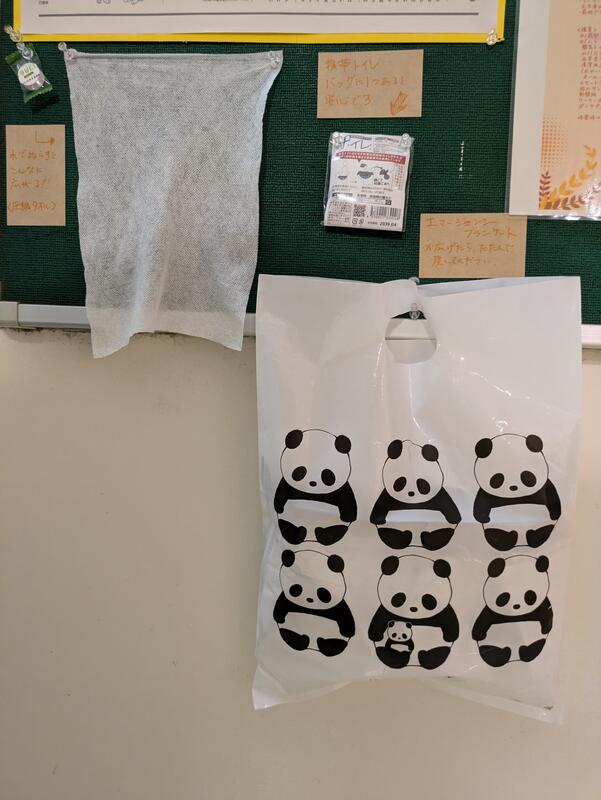 左下のは、圧縮タオルを濡らして広げたものと、携帯トイレです。