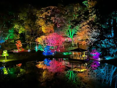 日本庭園のライトアップに包まれ、まるで幻想的な別世界へ迷いこんだような非日常を味わえます。夜空に浮かぶ牛深ハイヤ大橋の輝きも相まって、至極ロマンティックな夜に。心奪われる特別な景色をご堪能ください。