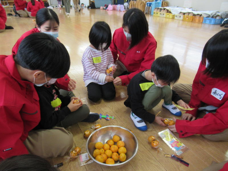 晴天であれば芋掘でしたが、当日は雨が降ったため屋内での交流学習となりました。ハロウィンにちなみミカンでお化けを作ったり、折り紙で可愛いクローバーやかっこいい手裏剣を作ったり、有意義な時間となりました。