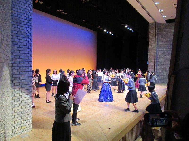 ステージ袖でサプライズブーケの説明をして、2年生活科学科の生徒がステージにブーケを持って登壇しました。