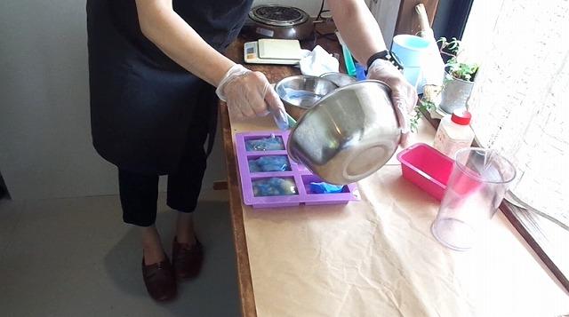 私たちが製作途中の「手作りにがり石鹸」のデザインは、天草の海を泳ぐイルカ(イルカウォッチング)なので、海をイメージできるようなマーブルデザインの技術を習うことができました。