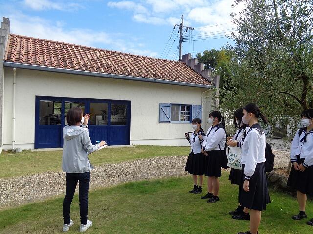 令和3年10月11日(月)、「地域との協働による高等学校教育改革推進事業」の一環として、私たち生活科学科3年の「手作り石鹸班」は、天草市五和町御領にある「天草オリーブ園AVILO」さんを訪問し、手作り石鹸に使用しているオリーブ油について、オリーブの木の栽培からオリーブの実の収穫、オリーブ油の生産方法について知識を深める事ができました。天草産のオリーブ油は高額なので、今試作中の手作り石鹸の材料として使用する場合は、ブレンドしたオリーブ油としてなら使えそうに思えました。