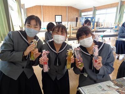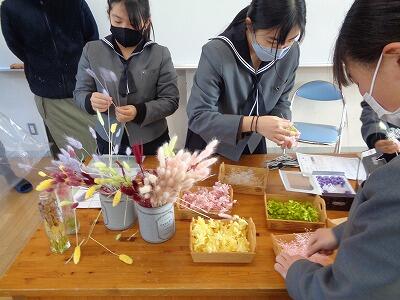 令和3年度12月20日(月)、「地域との協働による高等学校教育改革推進事業」の一環として、天草地域の切り花の消費拡大につなげるため、天草市にある「FLOWER Shop 花よど」さんの淀川さんを講師として招聘し、私たち生活科学科2年生18名は切り花のドライフラワーを利用した加工品(ハーバリウム)の製造方法について、必要な知識と技術を習得することができました。