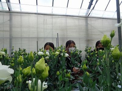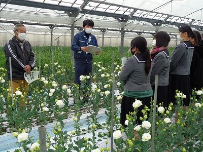 令和3年12月17日(金)、「地域との協働による高等学校教育改革推進事業」の一環として、天草地域の事業所の視察を通して、天草の地域資源を活用した事業について学び、将来の産業を担う職業人としてのあり方について考える機会を設け、今後の学習活動の深化へとつなげるために、私たち生活科学科2年生18名は、天草市新和町小宮路にある新和花き団地の中の札元農園さんの温室を訪問し、トルコギキョウの栽培から収穫について知識を深める事ができました。また、1人1本、好きな色のトルコギキョウをお土産にいただきました。