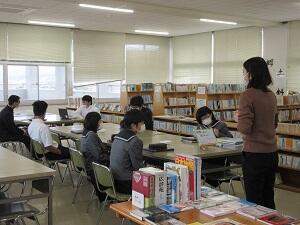 司書による本の借り方・返し方の説明を聞き、その後、マリン校舎図書館の利用についての動画を視聴しました。