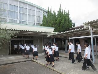 12時ちょうどの非常ベルの音と共に、生徒、職員一斉に避難しました。全員私語等なく、慌てず、速やかに避難することができました。体育館では教頭先生のご講話、そして各クラス代表生徒と新転入された先生方が訓練用の「水消火器」を用いて消火体験を行いました。生徒、職員、全員が万が一の事態に備え、防災意識を高めることができました。