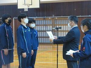 続いて行われた終業式では、中村校長が「2学期を振り返り、2日間に渡り開催されたマリン祭や2年生の修学旅行など実施できた行事がある一方、長距離走大会の中止や行事の変更も相次いだ。先日のサッカーW杯を振り返り、これまでの大会との違いなど『新しい景色』が見られた。みなさんも高校3年間や卒業後にどんな景色を見たいか、そしてそのためには『今、何が必要か』を考えてみてほしい。冬休み期間に新しい景色を見るための夢や目標を立ててほしい。」と述べました。