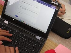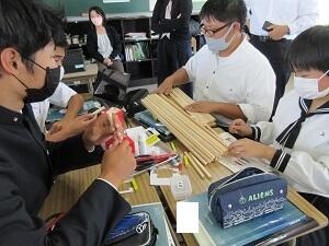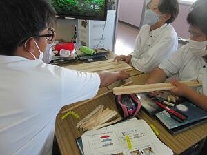 桟木は数種類あり、グループで課題を解決していきます。完成した制作物は、ChromeBookで撮影し、画像を送信します。
