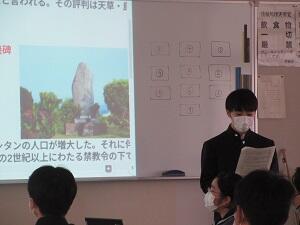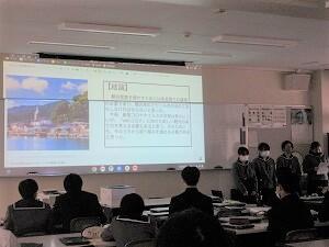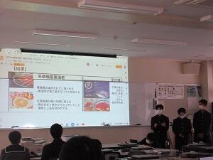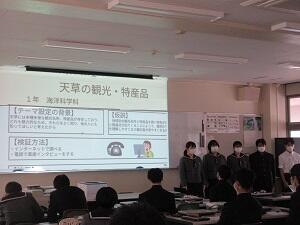 1年生は、KSH【熊本スーパーハイスクール】の取り組みとして、10月から「総合的な探究の時間」において地域課題の発見や探究活動に取り組んでいます。自分たちの興味や関心を持ったことの中から、水産物や食文化、歴史、流通など10のグループに分かれて、研究を進めてきました。