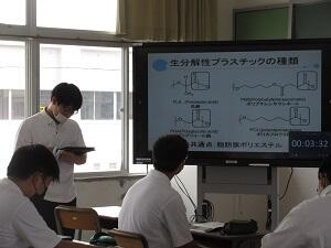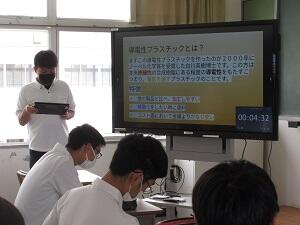 ①新しく開発されているプラスチックの特性について、本やChromeBookで調べ、スライドでまとめました。スライドは、見やすい配色になっているか、写真や図なども効果的に示します。参考文献や出典も明記します。