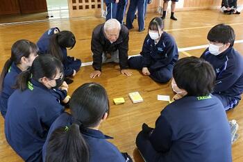 狩猟模擬体験では、はこ罠、くくり罠、猟銃に触れて体験しながら、取り扱うポイントや具体的な狩猟の方法について実演形式で説明・体験をさせていただきました。生徒たちは興味津々ではこ罠に入ってみたり、模擬銃をてにとり、その重さや射程距離、それぞれの狩猟におけるメリット、デメリットについて学び、狩猟をより身近に感じることができたようでした。