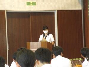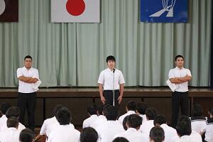 全校集会では、生徒会役員から6月の目標の「中間考査の反省を生かし、計画的な学習に取り組むと生活習慣を見直し、体調を整える」の2つが述べられました。