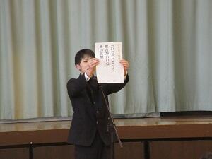 2月の全校集会が行われ、今月の月目標と人権標語が発表されました。