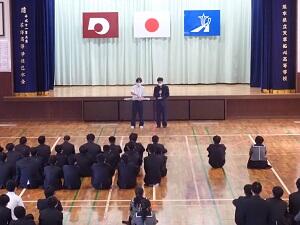 続いて行われた終業式では、鬼塚校長が「『今年1年を漢字一字で表すとどんな漢字が浮かびますか?』と問いかけた。私は、多くの分野の人と関わり、人と人の結び付きを実感したから『人』を選んだ。ある企業が高校生対象に行った調査では、1位『楽』、2位『推』、3位『恋』が選ばれたそうだ。2位『推』では、自分の推しは拓心生の皆で、授業、実習、行事、地域との連携などを見ていると、もっと応援したいという気持ちになった。さまざまな場面での活躍があり皆の可能性を強く感じた一方で、まだまだ余力が残っているのではないかと感じることもあった。自分の学生時代を振り返ってみると、あまり得意ではなかった英語の授業で頑張って暗唱し発表した時に誉められたことが『やる気』となった。何かのきっかけが自分の可能性を大きく伸ばすことがある。もし、うまくいかなかった時は原因に立ち返り、次に活かすことが大切である。春休み期間、特に寮生は家族との時間が増える。リフレッシュするとともに自分と向き合い、目標を立てる時間にしてほしい。新年度、元気そしてやる気に満ちた顔で会いましょう。」とあいさつしました。