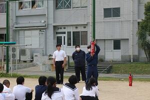 避難の状況を見ていただいた署員の方から「グラウンド避難に要した時間は、3分18秒。実際の火災では、冷静に行動し、火元から離れた避難ルートを自分で考えることが大切。」と講評をいただきました。また、119番通報の注意点、海へ出かける時の注意点などについても教えていただきました。その後、消火器の操作方法についての説明を聞き、代表2名が水消火器で実演を行いました。