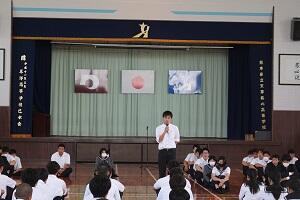 全校集会では今月の目標である「他人のためを思って行動すると一学期を振り返り、次学期に備える」が発表され、「他人のことを思いやって行動しましょう」と生徒会役員が述べました。