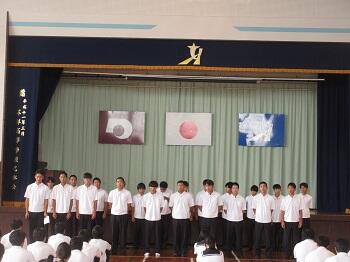 終業式では、鬼塚校長が「1学期をふり返りどうだったか。始業式に述べた目標設定はできたか?将来の目標達成のためには、周囲の協力者が必要。そのためには、自分を中心に行動するのではなく、相手を中心にした行動を取ろう。1学期の言動をふり返り、2学期は今よりもっと温かい学校の雰囲気にしていこう。夏休みは、健康やSNS等のトラブルに注意しよう。」とあいさつしました。