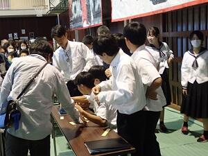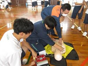 署員の方の講話やデモンストレーションの後、意識確認や胸骨圧迫などの心肺蘇生法、AEDを使用して実践しました。講座の中で、「実際にその場面に遭遇した時に、何もせずに救急車の到着を待つのではなく、どんな対応を取るかが大切。現場での行動が命を救う。」と話されました。最後に、代表生徒がお礼の言葉を述べました。