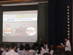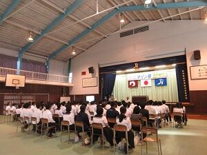 そして、生徒を代表して生徒会長が「マリン校舎では、水産系高校ならではの行事も多数あります。そのような行事や授業を私達と共に取り組んでいきましょう。これから宜しくお願いいたします。」と歓迎の言葉を述べていました。