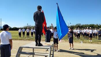 推戴式では、各部の代表生徒が大会への抱負を述べました。水村副校長の激励の言葉に続き、サッカー部主将が力強く選手宣誓を行いました。最後に全校で校歌斉唱を行い、選手たちにエールを送りました。