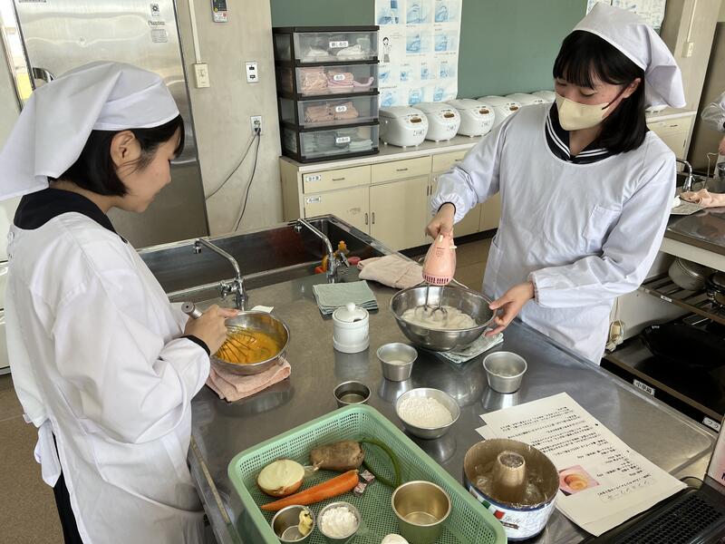12月11日(月)18日(月)3年生活科学科と3年食品科学科の生徒が米粉を使ったシフォンケーキやシチューを作りました。