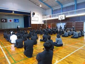 続いて行われた終業式では、鬼塚校長が駒澤大学附属苫小牧高等学校・野球部の冬季練習や、女子マラソン・高橋尚子さんの座右の銘などを紹介し「マリン祭や長距離走大会、修学旅行など行事も多かった2学期。周りに流されたりしなかっただろうか。高校生活は社会に出て活躍する準備の時期。冬休みは、自分を見直す機会にしてほしい。1月9日、全員で始業式を迎えましょう。」とあいさつしました。
