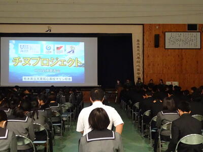 本渡校舎体育館を会場に令和5年度狩猟者PR事業(高校生への鳥獣被害対策講座)が行われ、両校舎の2年生および本渡校舎生物生産科が参加しました。マリン校舎はオンラインで視聴しました。熊本県の野生鳥獣による農作物への被害は全国的にも高い水準にあり、講座を通して農林業被害防止の意識の高揚を図り地域課題への理解を深めました。